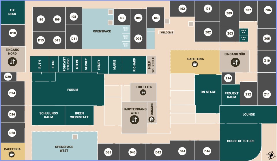 - Mitbenutzung von über 400 m2 Gemeinschaftsfläche wie Cafeteria mit Küche, Empfangslounge und Fokuszonen